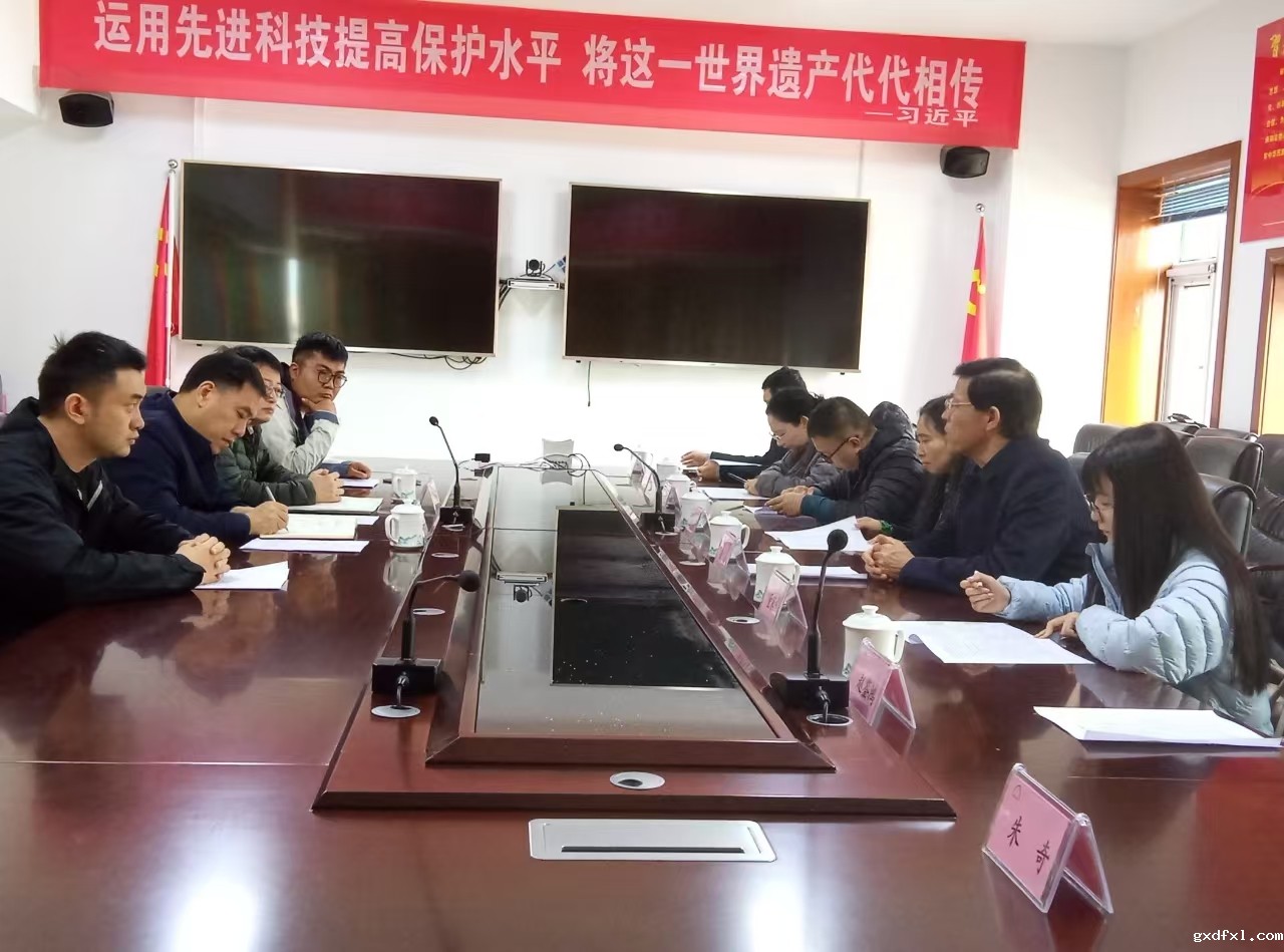 课题组一行首先来到麦积山石窟艺术研究所展开调研和座谈。甘肃省天水市人民政府副市长邬文玲对课题组一行的到来表示欢迎,并详细介绍了天水市在文化遗产保护、文化品牌建设、古籍保护等方面的成功经验。麦积山石窟艺术研究所所长裴强强就研究所发展沿革、管理机构以及古籍室、文物库房、雕塑临摹品工作室、保护监测室、科研实验室等文保部门情况进行介绍,并与课题组就世界文化遗产——麦积山石窟的文物保护与科技应用现状、经验和问题等展开交流。座谈会后,课题组一行参观“麦积山石窟保护规划历程展”,更为深切地了解麦积山石窟七十年来在文物保护、学术研究、文化弘扬与管理利用等方面取得的显著成果。