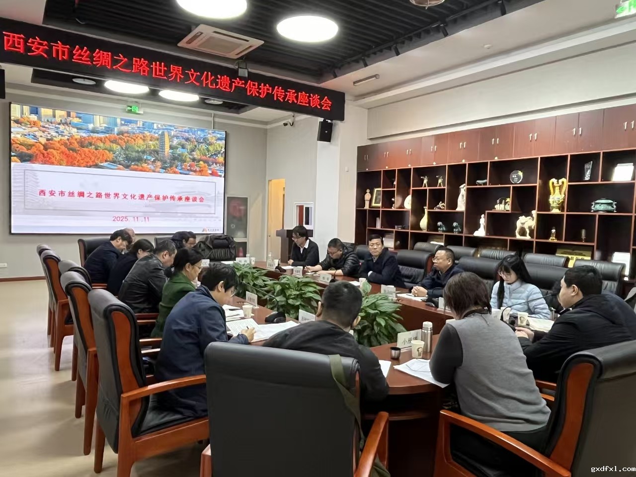 课题组一行还围绕“西安市丝绸之路世界文化遗产保护传承”这一主题,与西安市文物局、国际古遗迹理事会西安国家保护中心、西安市世界遗产检测管理中心、汉长安城大遗址特区管委会、大明宫遗址区保护办公室、西安市博物院、大雁塔、小雁塔、兴教寺塔等遗产地的有关同志展开座谈。课题组就课题设立的缘起、已取得的成果和下一步的工作计划进行介绍。西安市有关同志分别就各遗址点的申遗后的保护利用情况,特别是出台实施的一系列专项保护规划和配套管理、制度体系,预防性监测和数字化保护,科研创新推动遗产保护管理,遗产活化与利用,现有保护工作中面临的问题,以及下一步工作计划等与课题组进行讨论交流。西安市文物局副局长冯健认为此次座谈会召开意义重大,取得的成果有助于遗产管理者们梳理保护管理经验,遗产展示和利用相结合,破解并思考实践中的困难和难点等问题。曾军就扎实推动调研与深度研究丝路文化传承保护中,与地方文保部门展开更多的切实合作进行展望,并鼓励大家为推动中华民族伟大复兴作出贡献。